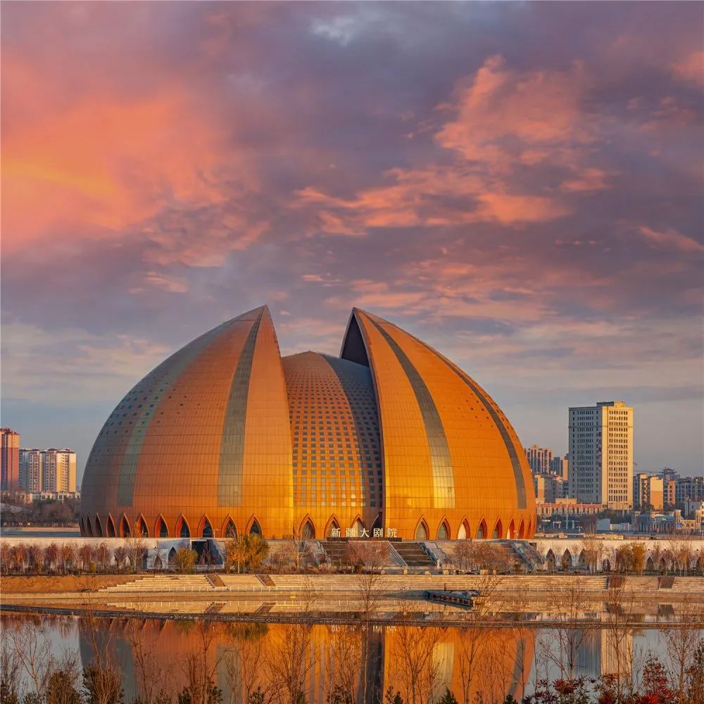 座落于昌吉的新疆大劇院,是中國目前最具民族文化特征的標(biāo)志性建筑,也是印象西域國際文化旅游產(chǎn)業(yè)園的核心建筑。主體坐落在平緩的臺基上,以盛開的天山雪蓮為原型,通過抽象與創(chuàng)新的設(shè)計(jì)手法,形成里外套層的穹頂造型主體形象。