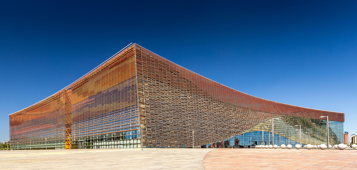 新疆克拉瑪依會展中心,1期(20,000平方米)和2期(40,000平方米)。1期會展廳可以被分隔為兩個各5,5000平方米的廳,公共大堂和廣場是室內(nèi)的,以響應(yīng)克拉瑪依寒冬氣候和盛行風(fēng)。1期的主大堂特意被做成超大尺寸以允許舉辦額外的超大展覽或?yàn)榱藵M足多個展覽的登記工作;1期大堂也通過人行天橋與2期連接。一個能夠容納超過300人的會議區(qū)域被置于大堂的上一層。